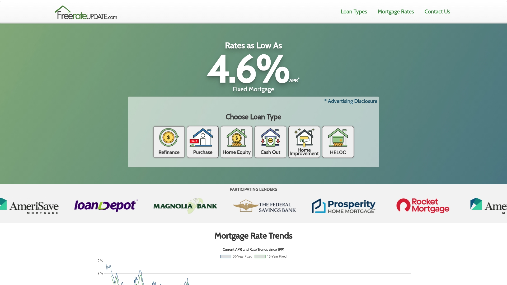 FreeRateUpdate.com offers loan type selection for refinance, purchase, FHA, VA, home equity, and cash out options paired with mortgage rate comparison and trend tracking. The site also lists a participating lender network and provides educational resources such as blogs, FAQ, and a mortgage calculator for quick estimates.